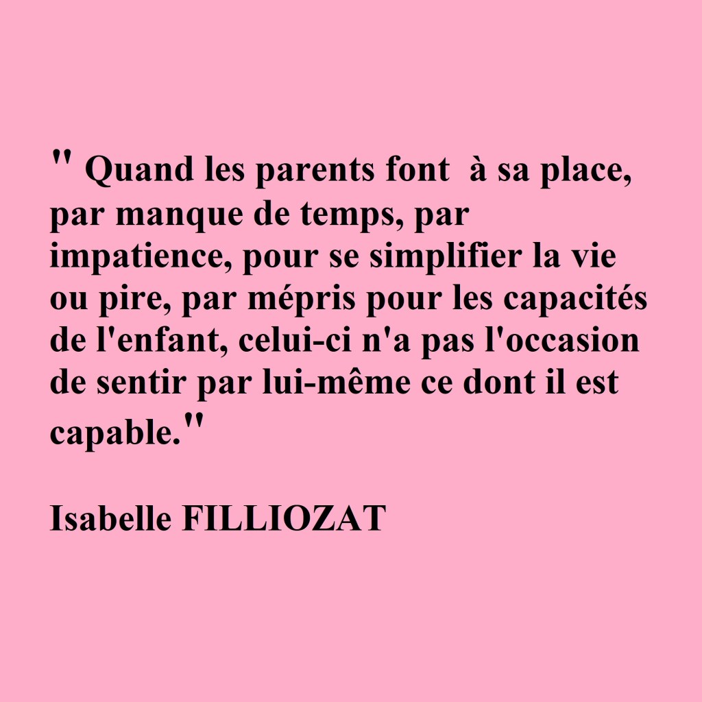5/ « Quand les parents font à sa place, par manque de temps, par impatience, pour se simplifier la vie ou pire, par mépris pour les capacités de l’enfant, celui-ci n’a pas l’occasion de sentir par lui-même ce dont il est capable ». Isabelle Filliozat
