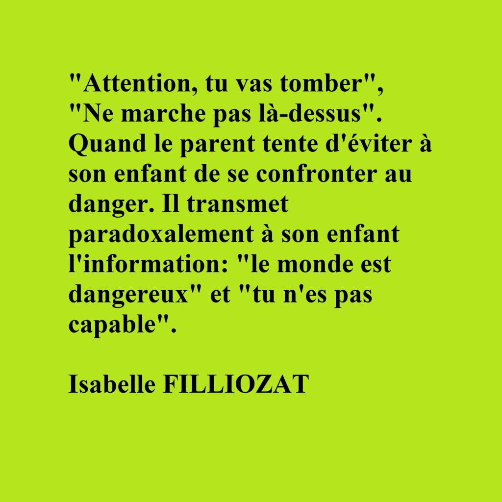6/ « Attention, tu vas tomber », « Ne marche pas là-dessus ». Quand le parent tente d’éviter à son enfant de se confronter au danger, il transmet paradoxalement à son enfant l’information: « le monde est dangereux » et « tu n’es pas capable ». Isabelle Filliozat