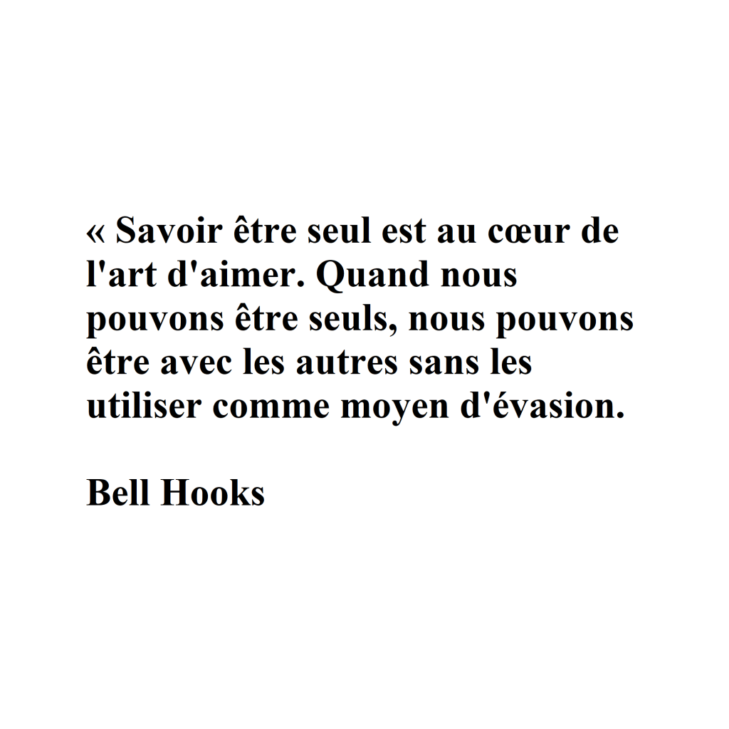 3/ « Savoir être seul est a coeur de l’art d’aimer. Quand nous pouvons être seuls, nous pouvons être avec les autres sans les utiliser comme moyen d’évasion. Bell Hooks